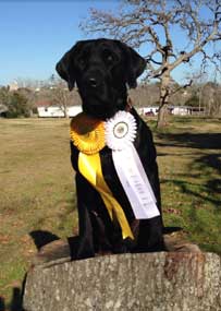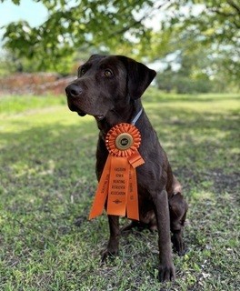 Angus with his first place ribbon and his 3rd and 4th place ribbons in January 2014 Derbies. Angus finished his Derby career with 12 placements in the 14 stakes he ran in and made the Derby list. Almost all of these stakes were run in the winter in OK, TX, and LA against the best dogs and pros in the USA. On 8-29-2014 Angus earned his QAA title at 29 months of age. Angus is from Maggie's second litter sired by FC HRCH Watermark's Texas Welcome MH.