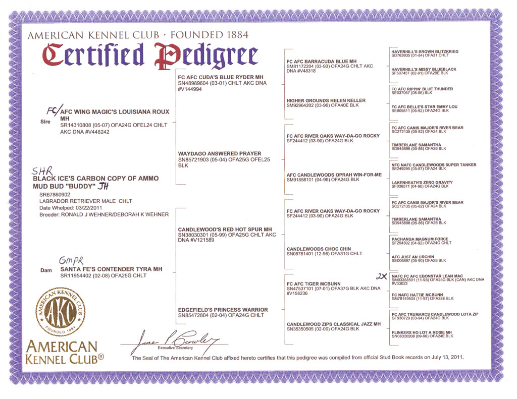 Rosie was sired by a 2 time National Field Trial Champion and comes from one of the oldest true line bred lines of Labradors left in the world and the line points as well! Glenbriar Bloodlines have produced 165 FTCHS & FTWS, 14 Championship Winners(NFC's), and 9 Top Retriever titles. No true bloodline in the world has done anywhere near this well in the filed trial world. Rosie is OFA Good, eye CERF is normal, PRA clear, EIC clear, and weighs 52 pounds. She has the complete package of natural traits and skills that a Labrador should have and has been an absolute natural to train. She has excellent drive, and is outstanding on land or in the water. Rosie is a happy girl with a great on/off switch. She takes training like she was already trained and is very calm in the house. She retrieved to hand the first day and every day since without force fetch training. I flew to Ireland to get Rosie in 2007 and have been so pleased with her that I flew back and picked up Glenbriar Primrose, a yellow female in May of 2011. This is Rosie's best and last litter. She was bred to HRCH Black Ice's Carbon Copy of Ammo, Mud Bud MH QAA. Buddy is a full brother to FTCH, AFTCH, NFC, AFC, NAFTCH Upon the Wings of an Answered Prayer(Ammo). Ammo was alos the high point Derby Dog in 2009 shattering the all time points record by 44 points. Ammo also holds the record for total Field trial points in a year as well as the record for winning 4 doubleheaders (open and amateur at the same event)in one season. Ammo may be the best Labrador to ever run AHC Fielld Trials. This breeding brings together the two best bloodlines in history from both sides of the Atlantic Ocean. Both lines are small Labradors with the complete package. These dogs can do virtually anything that they are trained to do, hunting wild birds on land or water, and competing at the very highest levels around the world. Buddy is OFA excellent/hips normal, EIC clear, CNM clear, PRA clear, eye CERF normal. Buddy earned his AKC Master Hunter title at 24 months, became QAA when is was 2 years old. and is now running open field trials with multiple JAM's so far. Buddy also points upland birds. The puppies are all black as Rosie only carries black genes but all puppies will have one chocolate gene. These pups are as genetically clean as any can be and should be loaded with natural skills and train very well and easily. A $200 deposit secures your spot in the picking order. 28 month of age health warranty for hereditary hip, elbow, and eye disease.