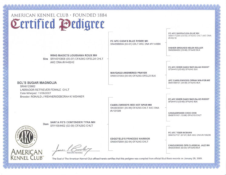 Sugar Magnolia was bred to FC It's All Over Baby Blue on Sept 23. 4 black and 7 chocolate pups born Nov. 20. Sugar Magnolia is a litter mate of NAFTCH-FC-AFC-FTCH-AFTCH Upon the Wings Of An Answered Prayer(Ammo) and 3.5x GMPR Roux's Golden Diamond in the Rough MH QAA. Ammo was the High Point Derby dog in 2009 and shattered the all time record for points earned. The previous record was held by Candlewood's Tanks A Lot(Lottie) who went on to win the NFC 3 times. Ammo just won the Canadian Amateur National Championship Field Trial in mid July of 2014 making her the most titled chocolate Labrador in the history of field trials. She is also the high point amateur dog for 2014 setting and new record with 95 points combined Amateur and All Age and finished second in All Age high points. She also won 4 doubleheaders stting yet another new record. Some pros are saying Ammo may be one of the best if not the best Labrador of any color to ever to run field trials. Ammo weighs 48 pounds. Maggie is a beautiful dark chocolate, well muscled Lab with great drive, nose, marking ability, and disposition. She weighs 56 pounds. Her first two litters have produced puppies that have easily earned hunt test titles and made the Derby list. Pups from these litters also earned QAA titles. They also were natural hunters with some hunting well at 5 and 6 months of age. The breeder 2011 NFC Watermark's Running back kept pick of the litter female puppy from her second litter sired by FC HRCH Watermark's Texas Welcome MH and has suggested that we repeat that breeding. Another pup from that litter was entered in 14 Derby field trial stakes in 2013/2014 and placed in 12 of them and was amateur/owner trained and handled. This pup was also the only pup to complete the 4th series in two stakes. A puppy from her first litter won a Derby stake beating the eventual high point Derby Dog of the Year and made the Derby list. Maggie has been a natural to train and has the most aggressive water entry we have seen. She is fearless and always gets the task done. She pointed the first upland bird she saw and her litters have all pointed also while excelling in the water too. Maggie is OFA hips- Good /elbows- normal, CERF is current, and CNM Clear. Maggie is an EIC carrier. Her first two litters produced "Derby List" and QAA pups and we expect no less from this litter. Her puppies from all of her litters have pointed as well. Maggie has no titles. We encountered employment issues through the long recession and had to cease all spending during Maggie's prime years to train and compete. FC AFC It's All Over Now Baby Blue was a field Champion with 6 wins and 42 Points, Amateur Field Champion with 4 wins and 35.5 Points, He has qualified for the 05,06,and 07 National Amateur along with the 08 National Amateur and National Open. 1 Titled Sibling - FC AFC Alpha Minnie Pearl and 4 Qualified All-Age siblings and 1 Master Hunter. Sired by FC AFC Tiger McBunn (10 Titled Offspring, 5 Titled Siblings), Dam: FC AFC Gator Points Sweet Potato Pie - First FC AFC Chocolate Female (5 Titled Offspring)Qualified for the 2005 National Open. Blue was Eic Clear, CNM Clear, OFA Hips Excellent/elbows normal. Blue was the number two sire of Labs entered in the 2016 Master National. The puppies will come with a 28 month of age health warranty for hereditary hip, elbow, and eye issues. The litter will be micro chipped and then EIC tested. Each puppy will come with a certified copy of it's EIC test report. None of the pups in the litter will actually have EIC(Exercise Induced Collapse) but some of the pups may carry one copy of the gene that causes it. It is only an issue for those who are going to breed their dog. For more information on EIC click on the following link: EIC Info. These puppies are $1000-$l500 depending on, male/female, EIC carrier/non carrier, plus sales tax(unless shipped) of 6.85%. Multiple deposits for females, two clear males and the stud owner will keep pick of the litter male for the stud fee. EIC clear pups will command the highest price even though all will have the same potential in the field and the home. Deposits are $200 and are refundable if your choice is not available in the litter. Deposits are also transferable to another litter. Serious pups for serious owners but these pups will also hunt on land or water as well as be great home companions.