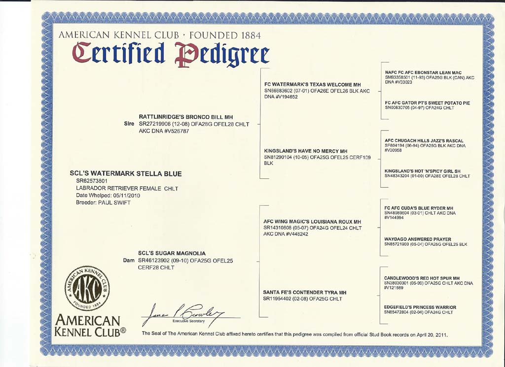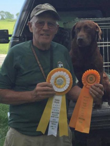 Stella is a daughter of our Sugar Magnolia and sired by MPR RattlinRidge's Bronco Bill MH. Willie was sired by FC HRCH Watermark's Texas Welcome MH. Maggie is a litter mate to Ammo, the best chocolate Labrador ever to run field trials. Stella is everything we hoped for when we bred her litter. Huge water entry. She oozes enthusiasm and energy. A very happy dog with the full package of skills. She has an AKC Senior Hunter title. Stella should be a Master Hunter but the depression forced us to cease competing her when she finished her SH title. Stella is great on upland birds with a strong nose and staunch point. Pointed 8 birds in an APLA CPR event. She is great hunting ducks also. Great nose and great handle and very intelligent. OFA hips good/elbows normal. DNA tested clear of CNM/EIC/PRA/Dilute gene clear. CERF normal. A happy dog that is great in the house as well. Dark chocolate with a perfect soft hair coat. Pure chocolate with no yellow gene. 54 pounds of muscle. Stella is my favorite Labrador. She is the cover girl on a bag of Red Flannel(Purina Mills)Prime Performance dog food. Proven producer of great puppies from multiple sires. Many references from satisfied clients. Porter is EIC Clear, CNM Clear, PRA Clear, OFA Good, and CERF Clear. Porter received his Senior Hunter Title at 19 months and his Master Hunter at 30 months. Porter has a Derby Win, 3 Qual 3rds, 1 Qual 2nd, 1 Amateur 4th, an Open 3rd, and numerous Open/Am/Qual/Derby Jams. Porter received a CPR (Certified Pointing Retriever) title and a MPR (Master) on the same weekend, 5 weeks into official pointing training. He received his GMPR (Grand Master) two weeks later. He is now a 4XGMPR. You'll be hard-pressed to find an all-around chocolate Labrador retriever and associated pedigree as good as Porter's. 29 dogs in the five generation pedigree have either an AFC, FC, or both. Porter's father is FC Nan-Dool Elwood Blues and his mother is Sommitt's "Little Rascal" MH. Some of Porter's grandparents and great grandparents include: FC AFC River Oaks Way-Da-Go Rocky, NFC AFC Storm's Riptide Star, NAFC FC AFC Ebonstar Lean Mac, FC AFC Carrolls Black Velvet, among many others. You just won't find that type of pedigree in a chocolate male. Porter lived to be 14 years old showing us another trait we value. We used Porter on Stella's mother Sugar Magnolia and were very impressed with that litter and expected no less from this litter and theA. 28 month of age warranty on hereditary eye, hips, and elbow issues. Pups are $1200 each and a deposit of $200 will hold your spot in the picking order. There are links below the pictures for pedigrees of both parents as well as a link to Porter's web page.