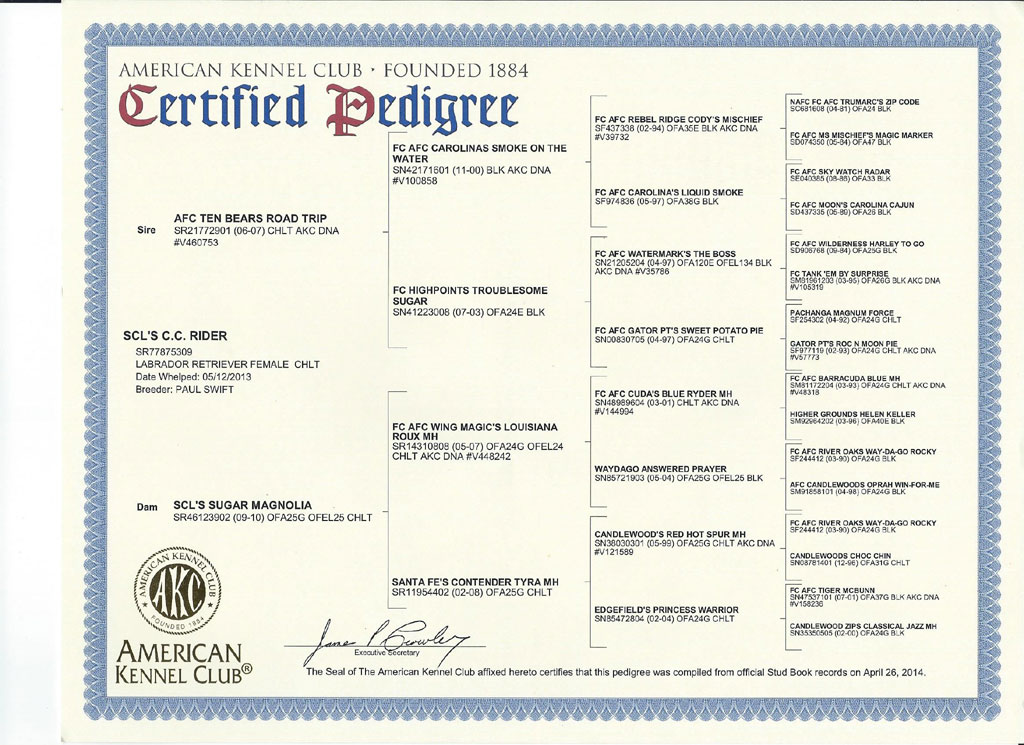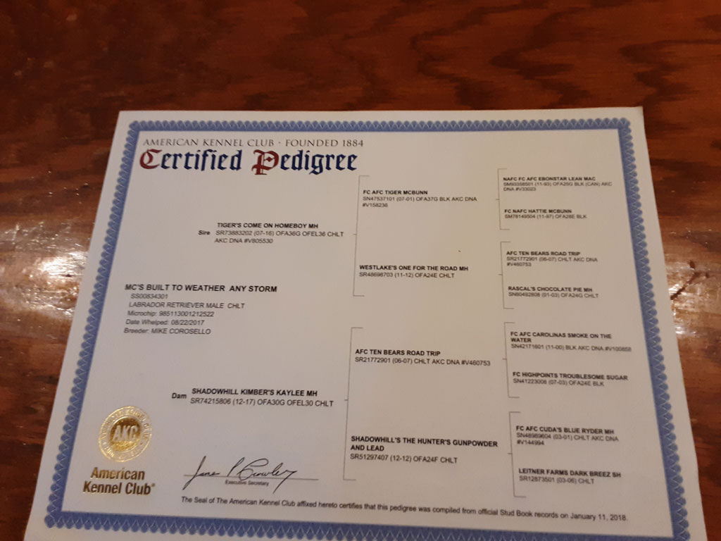GMPR SCL's CC Rider MH was bred to HRCH Mountain's Top Woody Sage MH QA2  on August 28, 2022. The litter was born on October 26, 2022 and will be 7 weeks old December 14, 2022. CC is DNA tested clear for EIC, CNM, PRA-prcd.  CC is also DNA tested clear for the dilute gene. CC has OFA hips GOOD and elbows normal. Eye CAER Clear/normal. Pure chocolate, no yellow gene EEbb. CC is a small but strong package at 50# with a huge heart. Highly inelligent, quiet, calm, happy, affectionate girl in the house that is a fearless machine in the field. Staunch hard pointer with an incredible water entry. CC is a daughter of our Sugar Magnolia, litter mate to Upon the Wings of an Answered Prayer(Ammo). Ammo is the most titled chocolate Labrador in history and holds 3 of the all time records in AKC field trials. CC was sired by AFC Ten Bear's Road Trip(Tick). Great dog with one of the best pedigrees ever for a chocolate stud. CC breezed through AKC Senior Hunter and Master Hunter titles. CC is a natural pointer and earned her GMPR title in the APLA in the fall of 2017 in straight passes. She was one of only 3 dogs to pass the test at one event. CC is an incredible dog with an excellent nose and a great marker. High flying fearless water entries and a machine in the upland field. She is a blind running machine on land or water! A great on/off switch being a great campanion in the house. The sire of the litter is HRCH Mountain's Top Woody Sage MH QA2. Sage is a medium sized, well muscled dark chocolate Labrador. 70 Pounds. Excellent demeanor, lives in the house when not out hunting, or competing in Field Trials. Sage is 5 years old and went 6 for 6 to earn his AKC Master Hunter(MH) title. Owner handled to multiple hunt test titles. 18 placements running Derby, Qualifying, and Owner/Handler quals. Sage is an outstanding dog earning high praise from pro-trainers and others who have seen him work! Sage's hips are OFA-Good/elbows normal. Clear for CNM, EIC, eye CAER clear/normal. Pure chocolate EEbb.  Some of the best bloodlines in the Pointing Lab/hunt test world and the Field Trial world have come together to create a truly exceptional litter! One of our best litters to date! We expect great things from this litter. Both parents are proven producers as are the extended bloodlines in their pedigrees. Whatever one endeavors to do with these puppies they will have to skills/tools to do so at the very highest levels.  Pups when adults should not be overly large dogs but will possess good strength and drive in the field, the total package of abilities a Labrador should have, and the intelligence to learn anything they are exposed to. Both parents are pure dark chocolate, no yellow gene. 28 month of age warranty for hereditary hip, elbow, and eye issues. ENS done on the litter. Males $1200, females $1500. Deposits $200, refundable if your gender choice is not available.